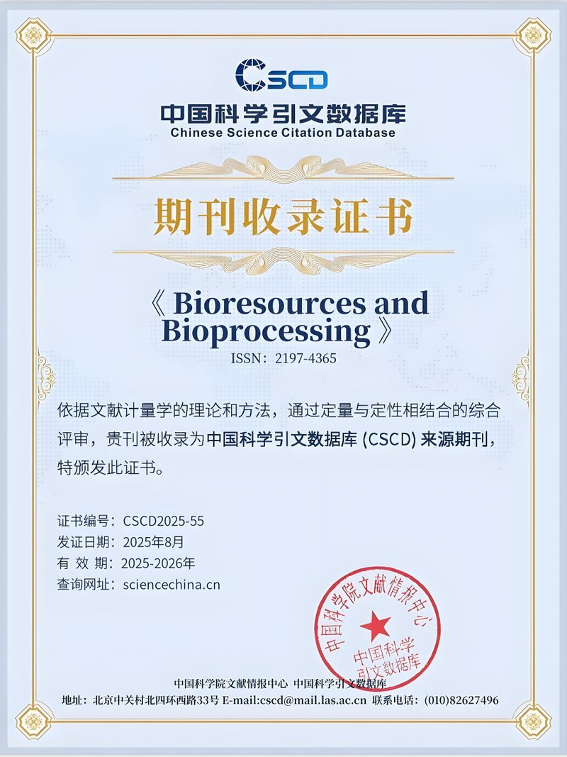附:Bioresources and Bioprocessing 是由华东理工大学生物反应器工程全国重点实验室与Springer Nature合作出版的英文学术期刊,ISSN为2197-4365,全面实行开放获取。目前已被SCIE、ESCI、EI、PubMed Central、DOAJ、Scopus、PMC、CSCD等重要数据库收录。2024年最新影响因子稳步提升至5.1,学科排名25/177,位列JCR Q1区,CiteScore达9.5。2024年入选中国科技期刊卓越行动计划二期入选项目,2025年荣获Springer Nature“服务影响力奖”。官网地址为http://www.bioresourcesbioprocessing.com。