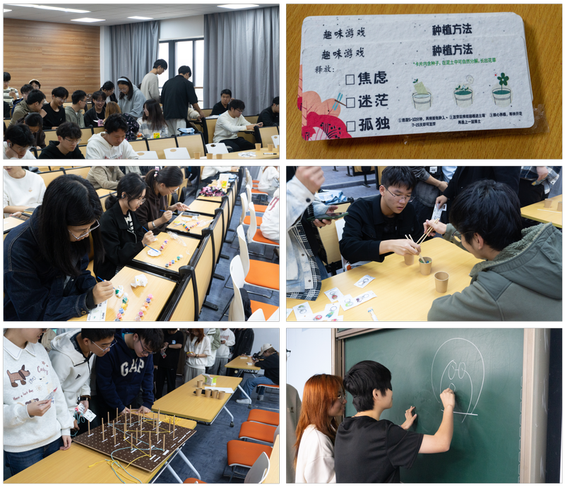 11月8日下午,“心晴计划”主题互动体验活动——“抛却烦恼,心‘晴’绽放”在奉贤校区温馨举行。60名同学通过三项精心设计的游戏,在轻松氛围中学习面对“焦虑”“孤独”与“迷茫”三大情绪挑战:“接力绘画”鼓励陌生同学协同创作,于欢声笑语中打破社交壁垒;“飞越地平线”以弹珠竞速引导参与者觉察并调节焦虑情绪;“人生模拟器”则通过毛线缠绕模拟人生路径,帮助大家具象化对未来的思考,有效缓解规划焦虑。活动现场还设有石膏彩绘自由创作区,为情绪表达提供了静默而丰富的补充出口。