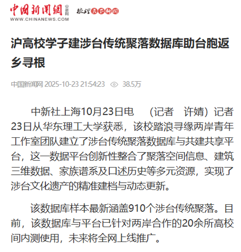 中新社上海10月23日电 (记者 许婧)记者23日从华东理工大学获悉,该校踏浪寻缘两岸青年工作室团队建立了涉台传统聚落数据库与共建共享平台,这一数据平台创新性整合了聚落空间信息、建筑三维数据、家族谱系及口述历史等多元资源,实现了涉台文化遗产的精准建档与动态更新。