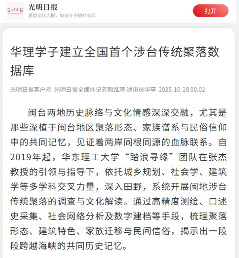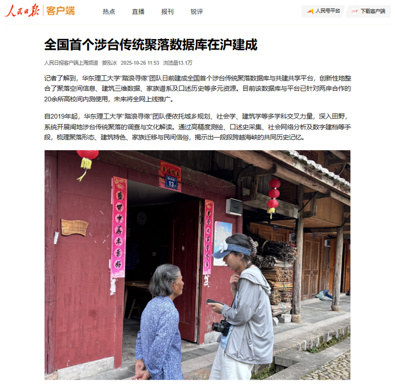 自2019年起,华东理工大学“踏浪寻缘”团队便依托城乡规划、社会学、建筑学等多学科交叉力量,深入田野,系统开展闽地涉台传统聚落的调查与文化解读。通过高精度测绘、口述史采集、社会网络分析及数字建档等手段,梳理聚落形态、建筑特色、家族迁移与民间信俗,揭示出一段段跨越海峡的共同历史记忆。人民日报客户端、光明日报客户端、中国新闻网、解放·上观、第一教育、新民周刊等媒体进行了原发报道。本篇选取了部分报道予以转载。