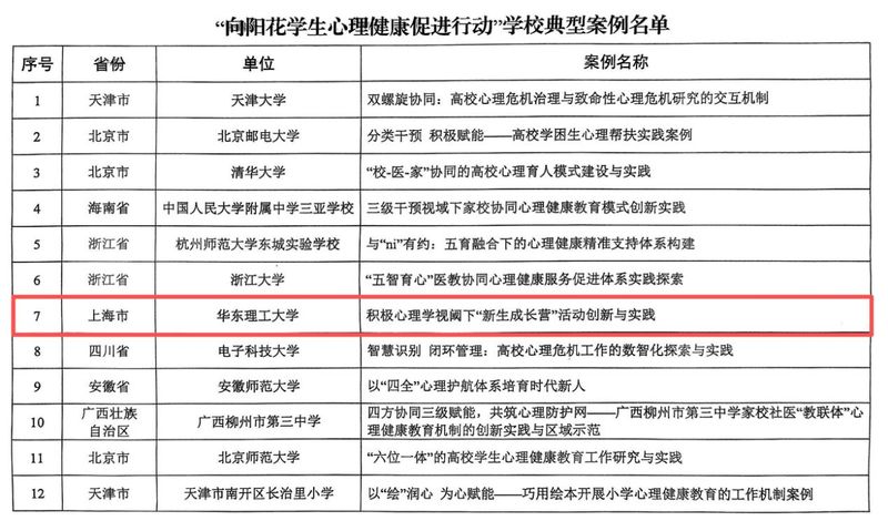 近日,教育部学生服务与素质发展中心公布了“向阳花学生心理健康促进行动”典型案例名单。我校《积极心理学视阈下“新生成长营”活动创新与实践》案例成功入选学校典型案例(全国共20个)。