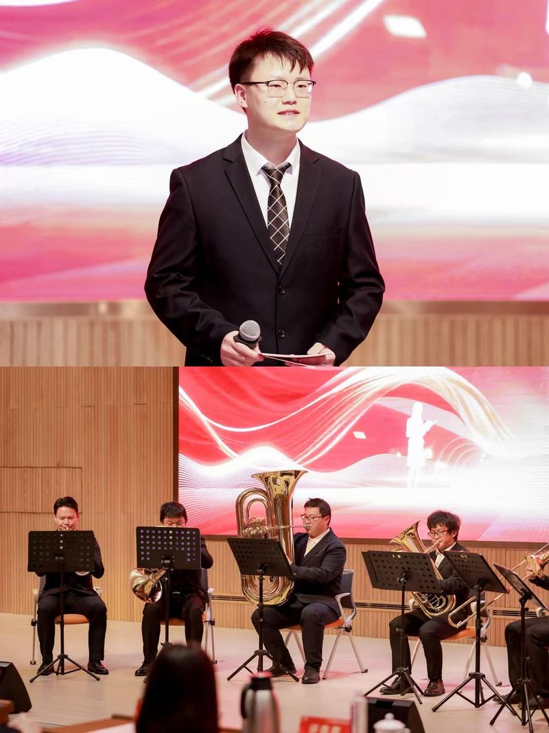 本次宝钢教育奖颁奖仪式的主持人为今年9月入职宝武钢铁集团、我校资源与环境工程学院2022级博士研究生郭松灵,他同时还是2024年度宝钢优秀学生奖获得者。此外,我校管弦乐团还应邀参加了颁奖仪式,演绎了《钢铁洪流进行曲》。