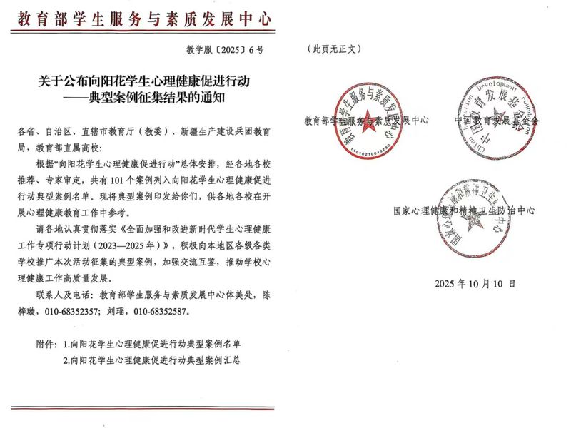 近日,教育部学生服务与素质发展中心公布了“向阳花学生心理健康促进行动”典型案例名单。我校《积极心理学视阈下“新生成长营”活动创新与实践》案例成功入选学校典型案例(全国共20个)。