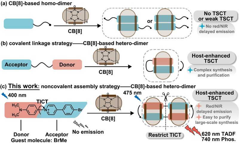 图片说明:通过非共价自分类策略实现基于CB[8]水相红色/近红外延迟发光示意图
