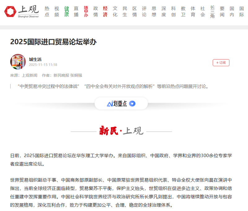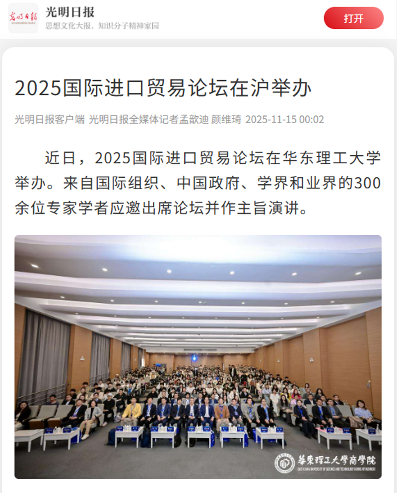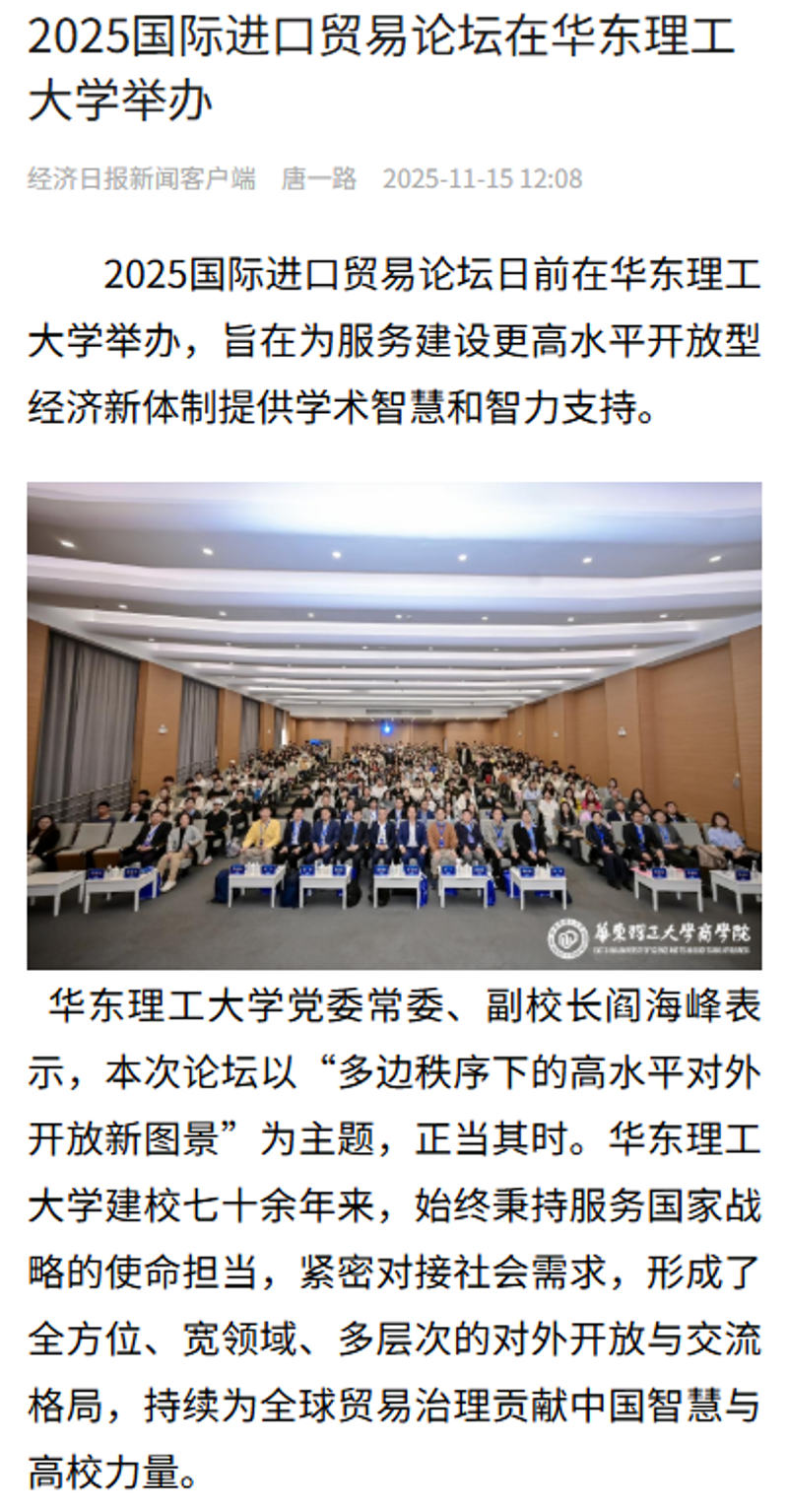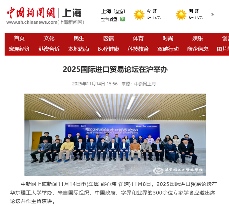11月8日,2025国际进口贸易论坛在华东理工大学举办。来自国际组织、中国政府、学界和业界的300余位专家学者应邀出席论坛并作主旨演讲。央视新闻客户端、光明日报客户端、中国新闻网、经济日报客户端、科学网APP、中化新网、新民·上观、第一教育、上海教育新闻网、广州日报新花城等10余家媒体,对此进行了原发报道。本篇选取部分报道予以转载。