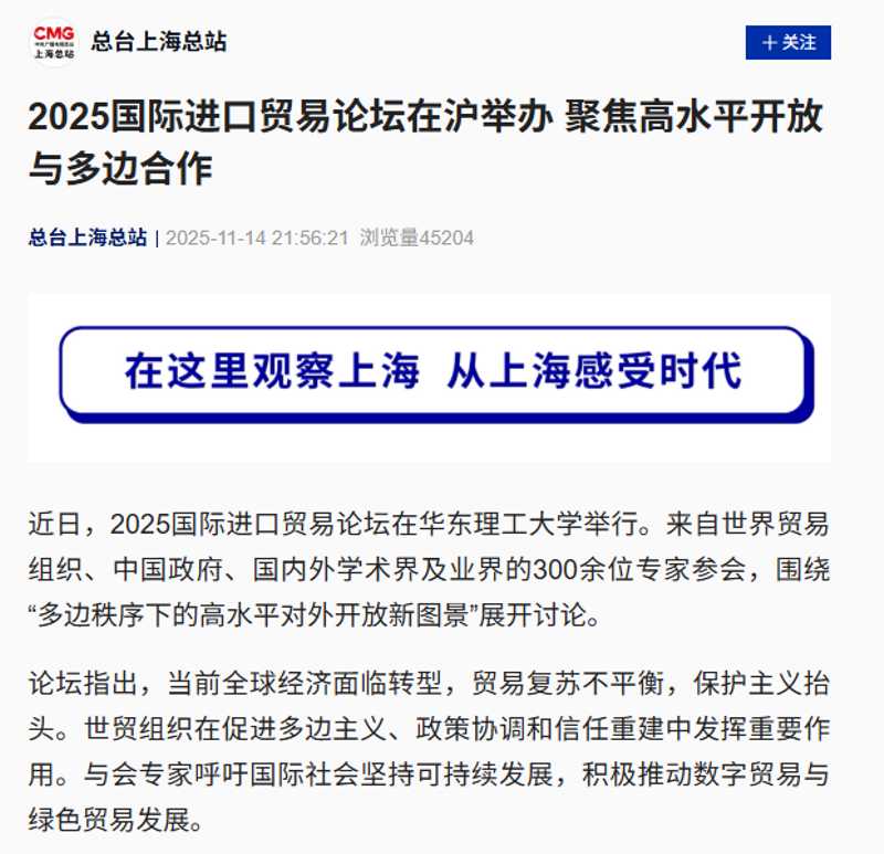 【央视新闻客户端】2025国际进口贸易论坛在沪举办 聚焦高水平开放与多边合作
