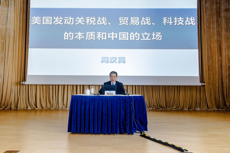 周汉民教授作为我国对外贸易与国际法领域的权威专家,以深厚的学术积淀和丰富的实践经验,为在场师生带来了一场思想深刻的精彩报告。这不仅是一场高质量的专业学术讲座,更是一堂启迪心智、坚定信念的“思政大课”。周教授用翔实的数据、生动的语言、鲜活的案例,从美国发动关税战、贸易战、科技战的背景由来,核心理念、现实影响以及中国的立场态度、应对之策等方面,分享了他长期以来对中美经贸等领域博弈的前瞻性、建设性思考。在传授知识、剖析时局的同时,周教授更勉励在场学子,要清醒认识我们所处时代的机遇与挑战,将个人所学与国家所需紧密结合,掌握一技之长、坚定发展信心,勇于迎难而上,努力服务国家和地方经济社会高质量发展。