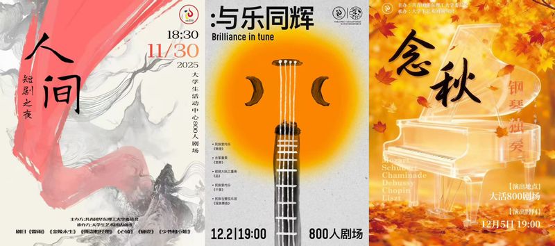 近期,我校大学生艺术团将在学校奉贤校区举办系列专场演出,分别是大学生话剧团“人间”短剧之夜专场演出、大学生民乐团“与乐同辉”专场演出、大学生钢琴团“念秋”专场演出,敬请广大师生关注,可通过文化校历平台报名观演。