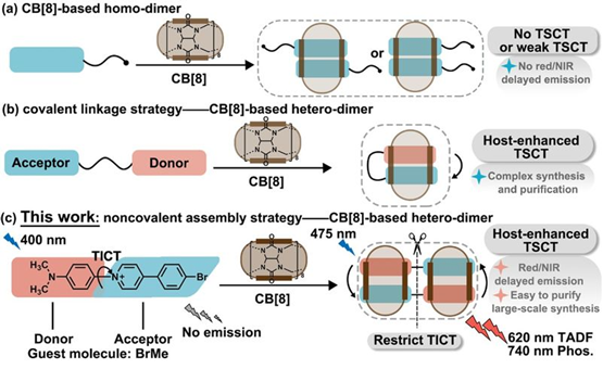 图片说明:通过非共价自分类策略实现基于CB[8]的水相红色/近红外延迟发光体系的示意图