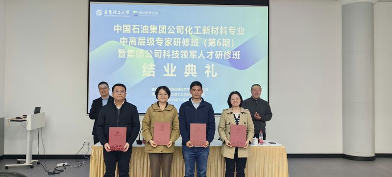 近日,由中国石油天然气集团公司主办、华东理工大学承办的 “中国石油集团公司化工新材料专业中高层级专家研修班(第6期)暨集团公司科技领军人才研修班”,于11月17日至22日在我校徐汇校区落幕。本次研修紧扣全球化工新材料产业前沿趋势,聚焦集团核心技术人才能力提升,旨在通过系统培训拓宽人才战略视野、增强创新思维、精进技术水平,为中国石油集团打造世界一流企业筑牢人才根基、注入智力动能。