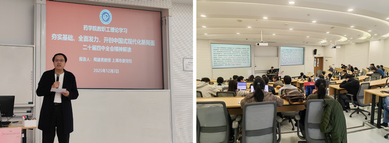 为深入学习贯彻党的二十届四中全会精神,近日,药学院召开教职工理论学习会。会议邀请上海市委党校周建勇教授作专题报告,学院党委书记倪炜主持会议,全体教职工参会学习。