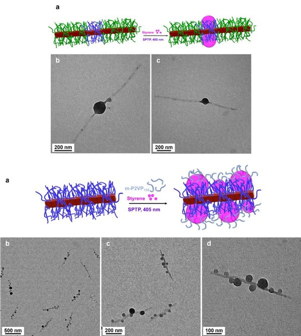 结合两种胶束结构的特性,研究团队开展了针对性后续处理。对于第一种胶束结构,其特定位置引发了PISA反应,研究团队在中间区段,即具有聚合活性的胶束上实施CDSA-s-PISA,制备出带有一个或两个珠状结构的长条形结构;而对于第二种全区段均具有聚合活性的胶束,通过加入定量大分子链转移剂实施CDSA-s-PISA组装,得到表面被珠状结构所装饰的棒状胶束。