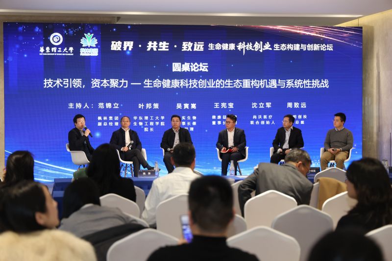 圆桌论坛由枫林集团副总经理范锦主持,修实生物吴寅嵩、善时医疗边俊杰、微康益生菌王宪宝、尚沃医疗沈立军、启明创投周致远及华理生物工程学院院长叶邦策参与对话,围绕技术转化、企业实践与资本赋能等话题展开深度探讨。