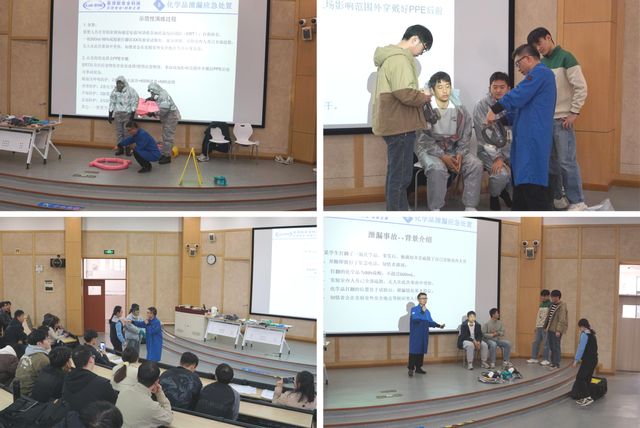 培训以“防护知识+实操演练”形式展开。理论环节,马宝意结合真实事故案例与实物演示,系统讲解呼吸、眼面部、手部、身体防护用品的功能差异、选配要点及正确使用方法,强调“无万能防护装备”原则;同时覆盖危险化学品分类、应急救援物资、喷淋及洗眼器规范使用等核心安全知识。化学品泄漏应急处置部分,马宝意介绍吸附棉、中和剂等应急物资的使用要点,明确“自身安全优先”的处置准则,并以硫酸泄漏为模拟场景开展示范性演练——指导师生正确穿戴化学防护服、全面具、防护靴、手套等防护装备,依次完成泄漏区域安全评估、吸附清理及废弃物处理的全流程操作。