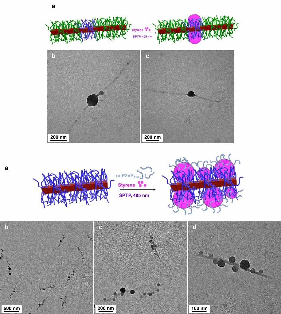 研究团队提出了一种创新策略:以CDSA制备的核结晶胶束为骨架,进一步通过PISA制备出更为复杂的纳米结构。研究人员首先合成了两种分子量分布窄的结晶性-无定型嵌段共聚物:聚芴三亚甲基碳酸酯-b-聚2-乙烯基吡啶(PFTMC-b-P2VP)和聚芴三亚甲基碳酸酯-b-聚丙烯酸叔丁酯(PFTMC-b-PtBA)。随后利用CDSA的特性,团队构建了两种长度均匀的一维胶束结构,其中一种在结构的不同部分具有不同的聚合活性,另一种则在整个结构上具有相同的聚合活性。基于第一种胶束结构在特定的位置引发了PISA反应,即在仅中间区段具有聚合活性的胶束上实施(CDSA-s-PISA),制备出带有一个或两个珠状结构的长条形结构;而对于第二种整段胶束均具有聚合活性的情况下,加入一定量的大分子链转移剂(macro-CTA)进行CDSA-s-PISA,得到被珠状结构所装饰的棒状胶束。