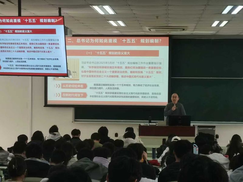 为深入学习贯彻党的二十届四中全会精神,深刻领会《中共中央关于制定国民经济和社会发展第十五个五年规划的建议》(以下简称《建议》)的核心要义,引导入党积极分子准确把握“十五五”时期的发展方向与使命任务,12月11日,数学学院、生物工程学院和物理学院在奉贤校区A101室联合开展入党积极分子培训班,数学学院党委书记鲍亮以“深悟党的二十届四中全会精神实质,扛起‘十五五’奋进新使命”为题,为入党积极分子讲授专题党课。