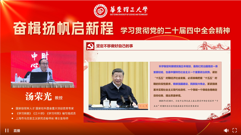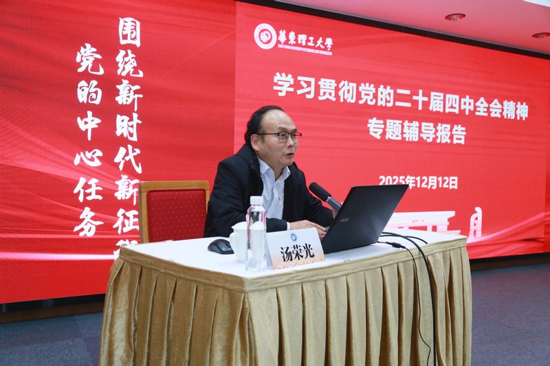 汤荣光教授以“奋楫扬帆启新程——学习贯彻党的二十届四中全会精神”为题,从“全面建设社会主义现代化国家”“开创中国式现代化建设新局面”“把握新征程上的重大政治任务”三个方面,全面宣讲和系统阐释了党的二十届四中全会精神。