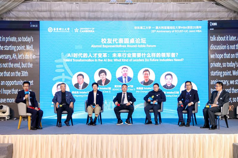 在校友代表发言环节,华东理工大学商学院校友理事会理事长李昭英、中国五冶集团有限公司原副总经理黄德鸽、山东键邦新材料股份有限公司总裁王卫星、长江金融控股(武汉)股份有限公司董事长兼CEO郝正明,结合各自职业历程,分享了在中澳MBA项目中的学习经历对其职业发展的深刻影响,并围绕数字化、AI、企业转型等前沿议题展开深入探讨。