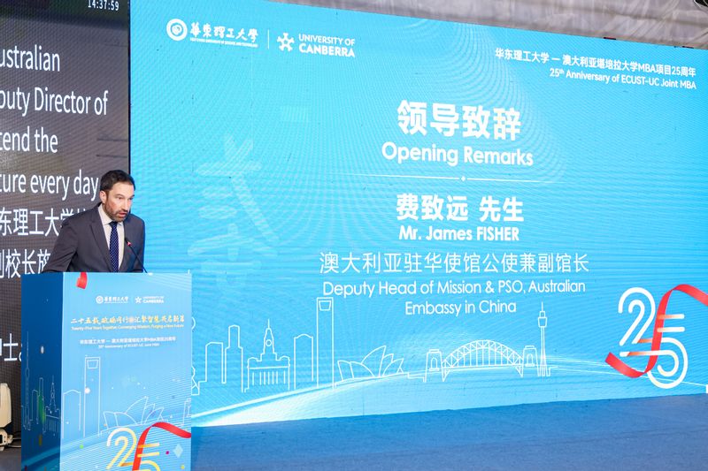 轩福贞在致辞中表示,中澳MBA项目是学校高等教育国际化进程中的一张“金色名片”。二十五年来,项目充分融合华东理工大学的工科底蕴与堪培拉大学的商科优势,构建了贯通中西、注重实践的课程体系,培养了一大批具有国际视野与本土实践能力的高层次管理人才。期待双方能继续深化务实合作,拓展教育创新空间,共同为全球高等教育发展贡献智慧和力量。