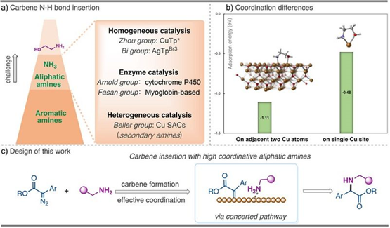 a)卡宾N-H键插入反应研究背景,b)MEA配位理论研究,c)研究设计思路