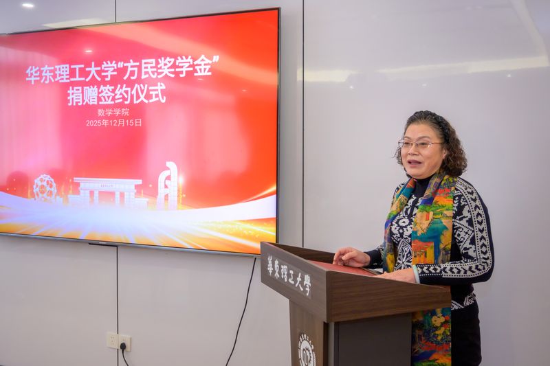 数学学院党委书记鲍亮介绍了“方民奖学金”的设立背景与捐赠情况。校友与发展联络处处长、上海华东理工大学教育发展基金会秘书长王芝眉与方民签署了捐赠协议。数学学院院长林辉球代表学院接收了捐赠支票,并为方民老师颁发捐赠证书。