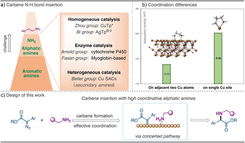 卡宾N-H键插入反应是构建C-N键的重要策略,可在多种胺类底物中实现高产率与高选择性转化。然而,脂肪胺因具备强配位能力,易导致金属催化剂失活。目前的应对策略主要依赖于大位阻配体的引入或工程酶提供的多重结合环境,在催化剂回收利用等方面仍存在一定局限性。