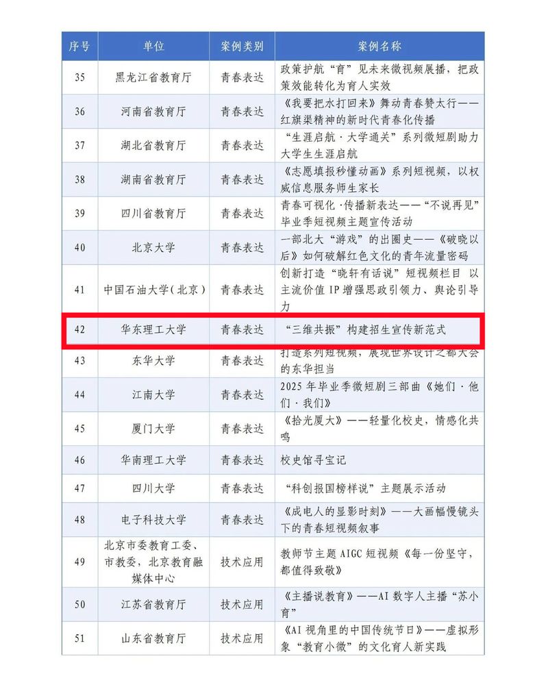 会议表彰了一批优秀融媒体平台和融媒体作品。华东理工大学(教育号)获评教育部2025年度教育融媒传播引领账号,并获最勤奋TOP1荣誉称号,党委宣传部报送的《“三维共振”构建招生宣传新范式》案例入选教育短视频2025年度案例。
