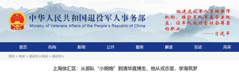 3.https://www.mva.gov.cn/fengcai/tyjrfc/tyjr/202504/t20250402_487619.html(上海徐汇区:从部队“小钢炮”到清华直博生,他从戎志坚,学海筑梦-退役军人-中华人民共和国退役军人事务部)