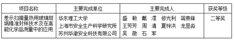 12月23日,中国安全生产协会第六届安全科学技术奖获奖名单揭晓,我校资源与环境工程学院上海市应急管理局重点实验室(化工反应安全)主任盛敏教授领衔的《差示扫描量热用玻璃坩埚精准封样技术及在高能化学品测量中的应用》获得“安全科学技术奖”科技进步二等奖。