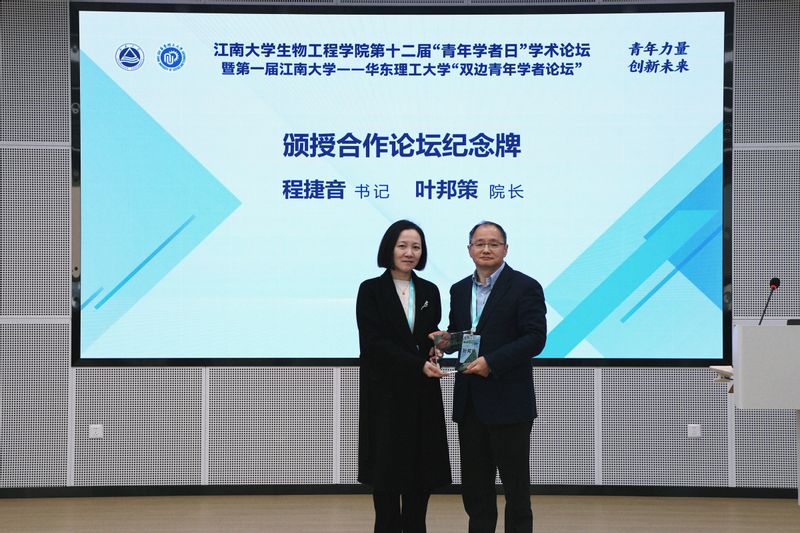 叶邦策代表我校生物工程学院致辞,回顾了双方长期以来的合作历程,表示将持续推动在学科建设、人才培养与科学研究等方面的深入互动,并对未来双方携手共进提出了殷切希望。程捷音代表江南大学生物工程学院向我校生物工程学院赠送合作论坛纪念牌。