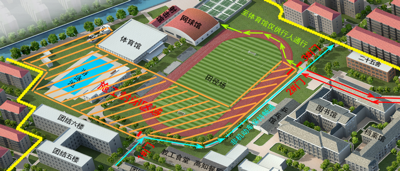 1.交通管理:施工区域将进行围挡封闭(见附图橙色阴影区域),施工车辆将从东门进出校园,沿行知路从操场东北侧“2#门”进出施工场地,车辆进出将尽量避开上下课、上下班及用餐高峰,并严格控制行进速度;施工期间团结六楼北侧将无法通行至体育场馆,但操场东侧现有非机动车道保持正常通行,师生员工可以从操场东北侧“3#门”步行进出体育场馆;如有特殊情况,特种车辆可从“1#门”或“2#门”穿行至体育场馆。