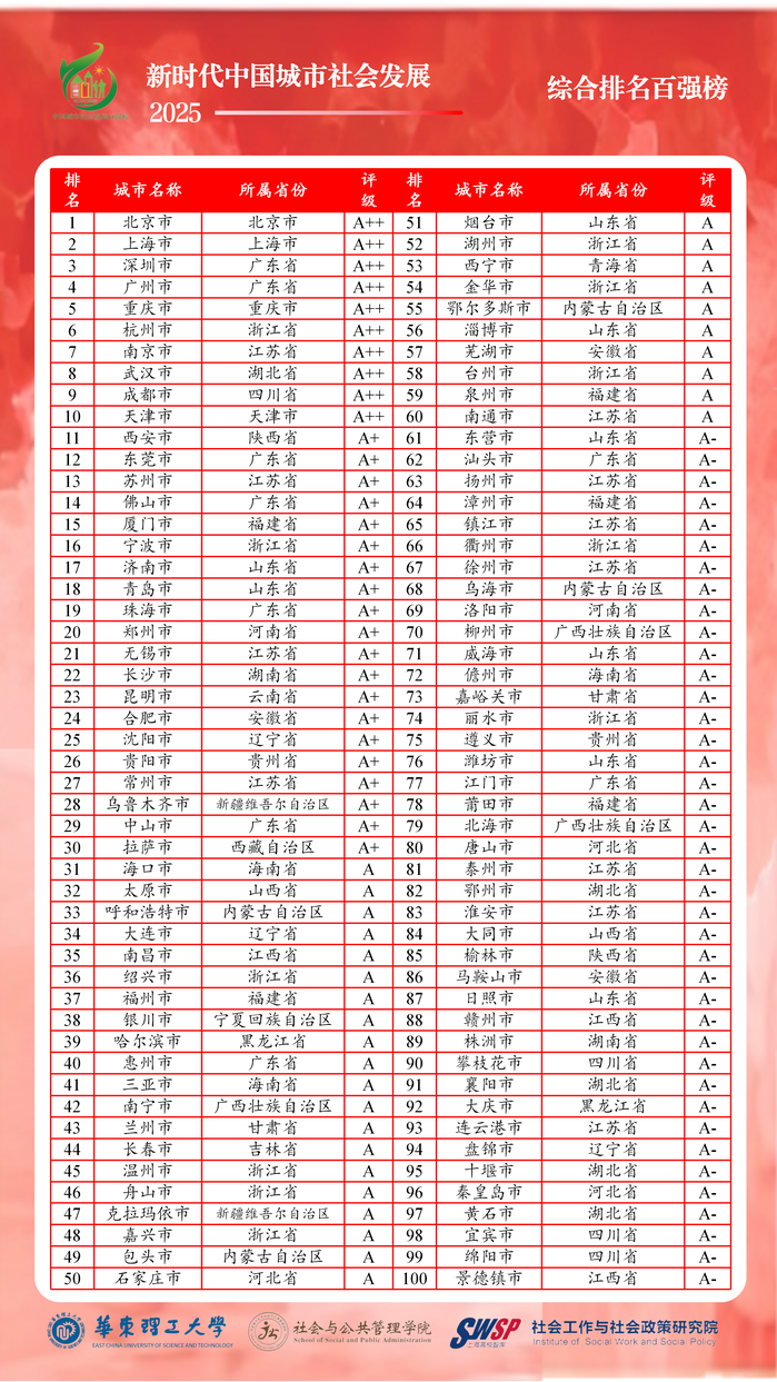 12月29日,“新时代中国城市社会发展指数暨百强榜(2025)”正式发布,这是华东理工大学持续第八年公开发布中国城市社会发展百强榜。