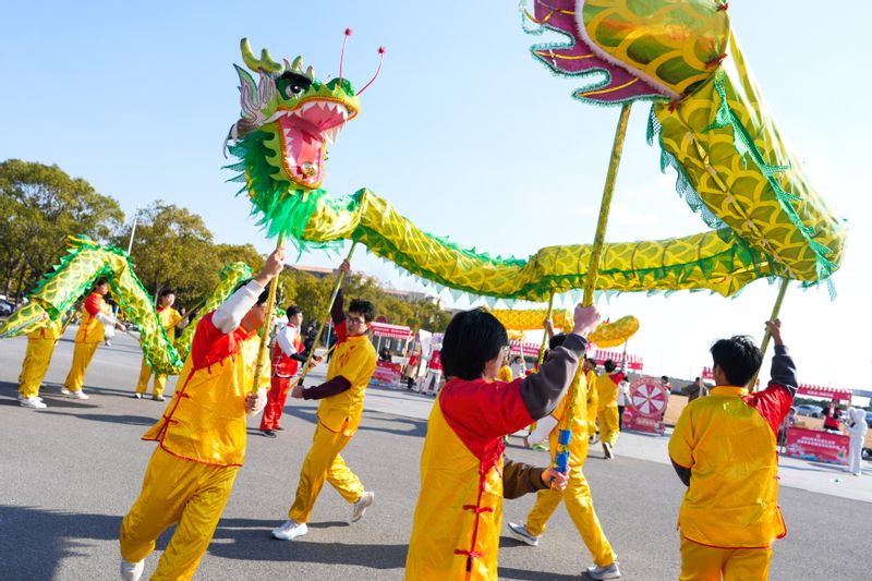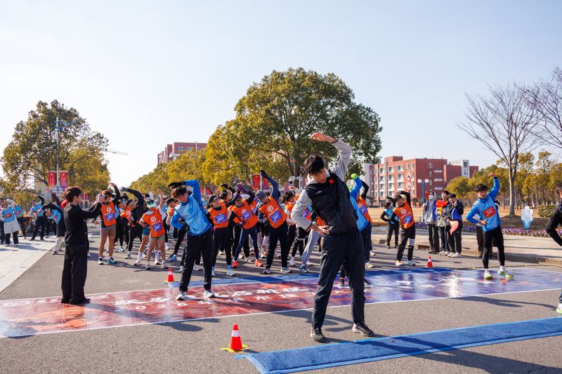 活动现场,体育学院舞龙队进行《龙腾青春》表演,随后,在2025年上海市大学生田径锦标赛男子甲组800米冠军、2024级生物工程学院本科生毕松涛,2024年河南省u系列田径冠军赛110米栏冠军、2024级体育与科学工程学院本科生周铭扬同学,及现场配速员的带领下,参赛者们进行了赛前热身运动。