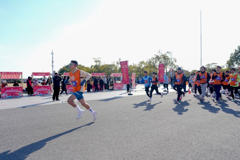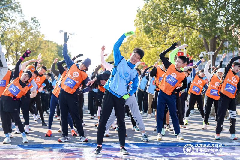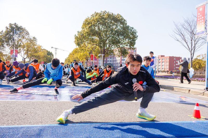 活动现场,体育学院舞龙队进行《龙腾青春》表演,随后,在2025年上海市大学生田径锦标赛男子甲组800米冠军、2024级生物工程学院本科生毕松涛,2024年河南省u系列田径冠军赛110米栏冠军、2024级体育与科学工程学院本科生周铭扬同学,及现场配速员的带领下,参赛者们进行了赛前热身运动。
