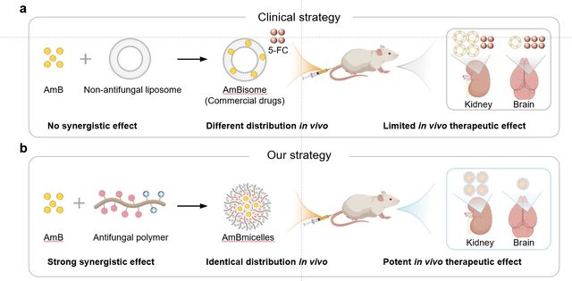 随着真菌耐药性日益增强,单一真菌药物治疗方案疗效往往不佳甚至失败。两种具有协同作用的药物组合,往往表现出比单一药物更高的疗效,尤其在耐药和难治的感染性疾病中表现出强大的潜力。尽管如此,真菌系统性感染尤其是脑膜炎,在临床上依然显示高死亡率。重要的原因在于抗真菌药物种类少导致协同药物组合数量非常有限,且两种药物不同的药代动力学和体内分布导致其很难在感染部位以协同比例分布,难以实现体外的协同效果。因此急需可以实现体内真实协同治疗耐药真菌感染的有效策略。