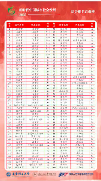 中新网上海新闻12月29日电(许婧)上海高校智库“华东理工大学社会工作与社会政策研究院”何雪松教授和吴开泽研究员领衔的智库重点研究项目“中国城市社会发展指数研究”课题组29日在沪线上发布“新时代中国城市社会发展指数暨百强榜(2025)”,这是华东理工大学持续第八年公开发布中国城市社会发展百强榜。