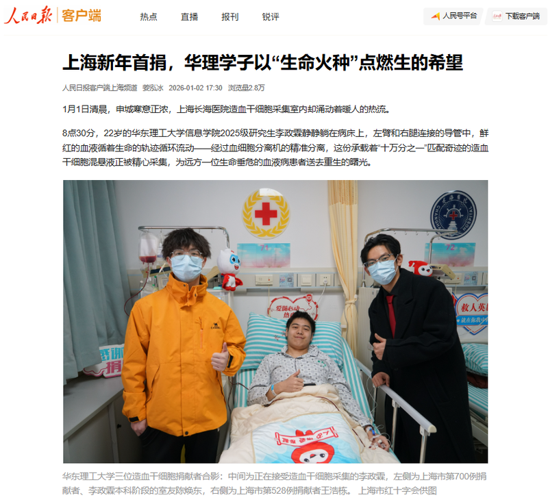 1月1日,我校信息学院2025级研究生李政霖作为2026年上海市首例造血干细胞捐献者,开启了新一年的生命接力,为一位生命垂危的血液病患者送去重生的曙光。新华社客户端、人民日报客户端、CHINADAILY、中国教育新闻网、澎湃新闻、解放·上观、文汇·上观、上海教育电视台、青春上海、第一教育、上海科技报、话匣子、上海徐汇微信公众号等10余家媒体,对此进行了原发报道。本篇选取部分报道予以转载。