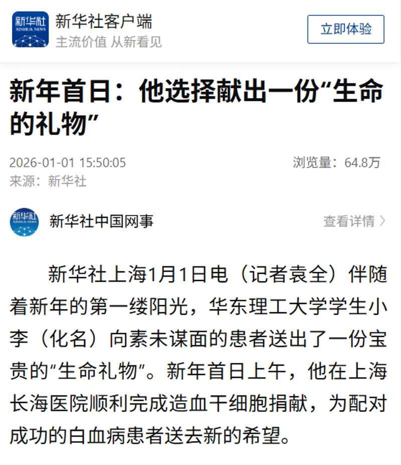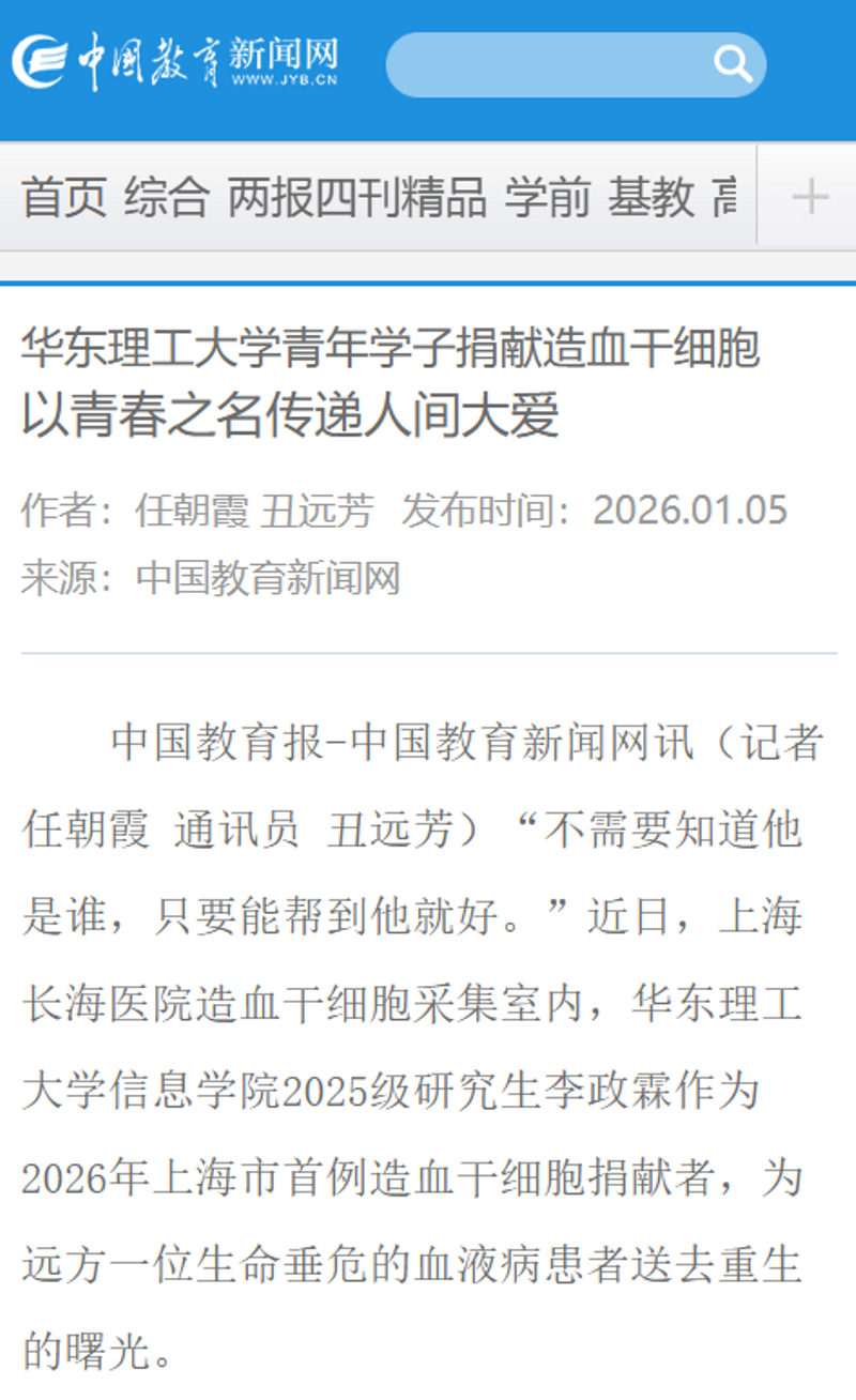 1月1日,我校信息学院2025级研究生李政霖作为2026年上海市首例造血干细胞捐献者,开启了新一年的生命接力,为一位生命垂危的血液病患者送去重生的曙光。新华社客户端、人民日报客户端、CHINADAILY、中国教育新闻网、澎湃新闻、解放·上观、文汇·上观、上海教育电视台、青春上海、第一教育、上海科技报、话匣子、上海徐汇微信公众号等10余家媒体,对此进行了原发报道。本篇选取部分报道予以转载。