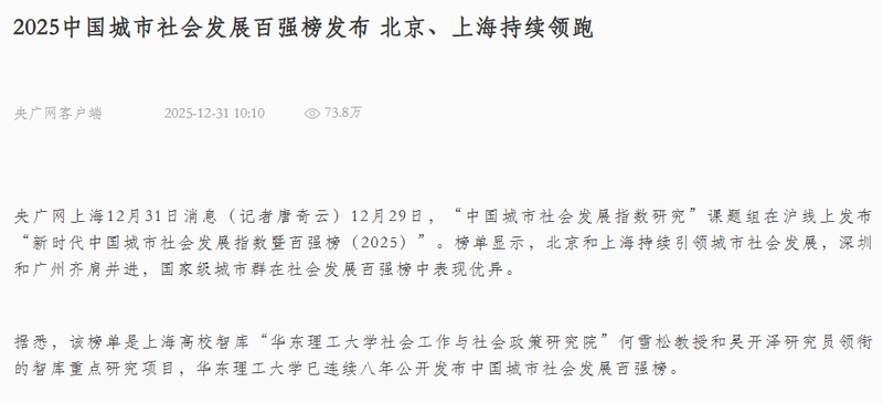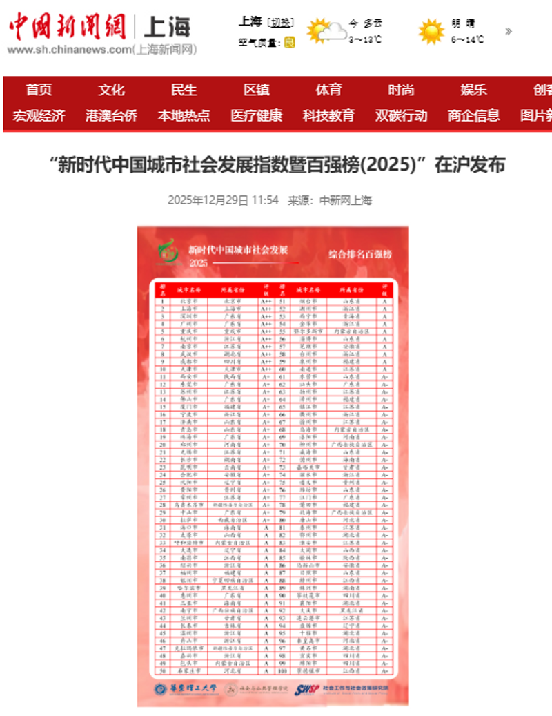 12月29日,“新时代中国城市社会发展指数暨百强榜(2025)”正式发布,这是华东理工大学持续第八年公开发布中国城市社会发展百强榜。
