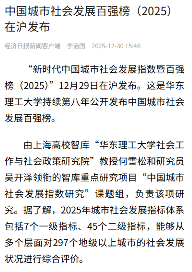 12月29日,“新时代中国城市社会发展指数暨百强榜(2025)”正式发布,这是华东理工大学持续第八年公开发布中国城市社会发展百强榜。