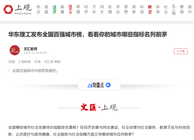 【文汇·上观】华东理工发布全国百强城市榜,看看你的城市哪些指标名列前茅