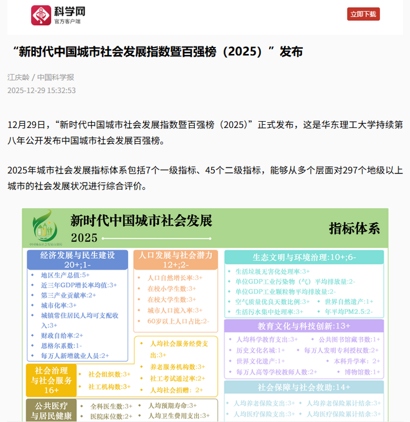 【科学网】“新时代中国城市社会发展指数暨百强榜(2025)”发布