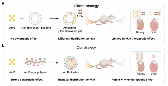 随着真菌耐药性日益增强,单一真菌药物治疗方案疗效往往不佳甚至失败。两种具有协同作用的药物组合,则能够表现出比单一药物更高的疗效,尤其在耐药和难治的感染性疾病中。然而,真菌系统性感染尤其是脑膜炎,两种药物在体内分布和药物代谢不同,很难实现体内协同效果,在临床上依然显示高死亡率,急需可以实现体内真实协同治疗耐药真菌感染的有效策略。