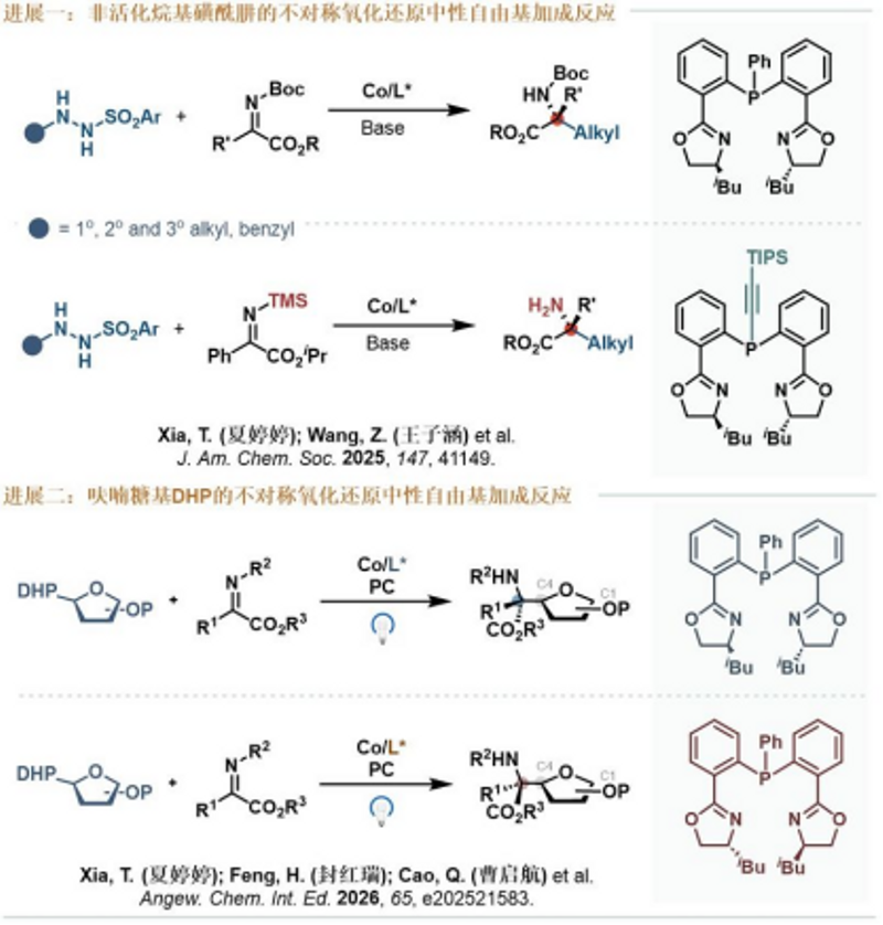 进展一:实现了钴催化非活化烷基磺酰肼与亚胺的不对称氧化还原中性自由基加成反应,高效、高对映选择性地合成了手性α-氨基酯类化合物。需要指出的是,该反应体系首次实现了N-三甲基硅基亚胺酯的不对称自由基加成,并通过原位脱硅过程,一锅法合成手性游离胺类产物,进一步提高了该反应合成应用价值。