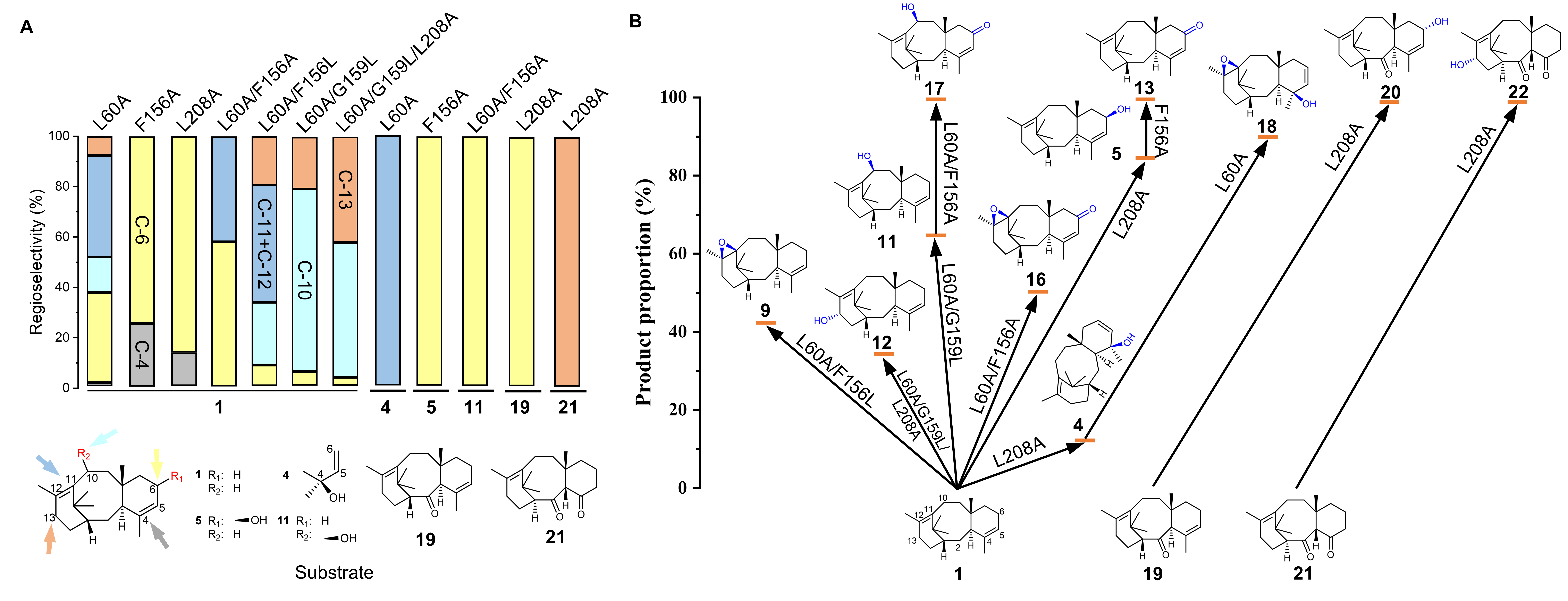 研究团队解析了TteUPO 的晶体结构,并通过重塑该酶底物通道,提高催化效率并拓展了氧化位点。进一步地,研究人员构建了一个包含7个关键突变体的氧化酶工具箱,能够对紫杉烷骨架的6个不同位点实现高区域和立体选择性的氧化。该氧化酶工具箱不仅对紫杉二烯具有良好催化效果,对多种氧化态更高的紫杉烷衍生物同样表现出优异的催化性能。