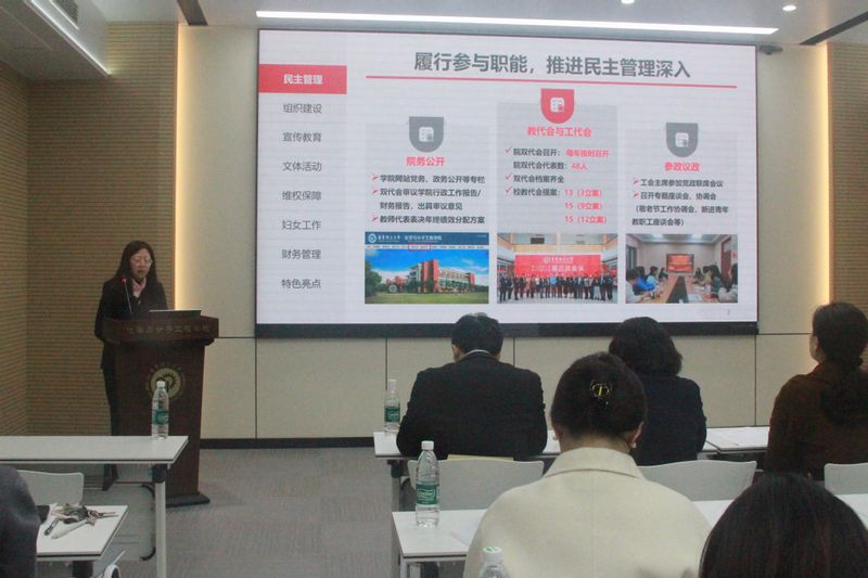 学院工会主席马海燕作2021-2025年度学院第五届工会委员会工作报告,从民主管理、维权保障、精神文明建设、工会自身建设等多个维度,全面总结了五年来学院工会工作成效。她表示,学院工会将继续发挥桥梁纽带作用,全心全意服务教职工,积极推动学院和谐发展。