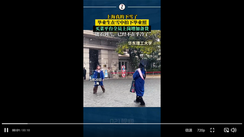 1月20日,上海在大寒节气遇上飘雪,许多上海网友纷纷晒出了自己拍到的雪景照和“超大片”雪花。在华东理工大学,毕业生们穿上毕业服在雪中留下与母校的合影。买菜平台全员上岗,增加20%备货,保障供应。你拍到的雪是什么样的?