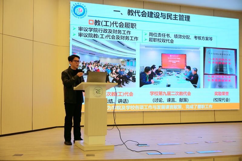 资环学院党委书记修光利代表学院党委感谢第五届教代会代表和工会委员的辛勤付出和对学院发展作出的重要贡献,并祝贺当选的学院第六届教代会代表和工会委员。针对新一届教代会和工会,他提出4点希望。第一,教代会和工会要一如既往提高政治站位,切实加强党的创新理论学习,成为教师政治理论学习和落实立德树人根本任务的坚强阵地。第二,教代会要切实履行民主管理职责,依法积极参与学院的重大决策和规划;工会要履行好维护教职工权益的职责,搭建沟通交流的桥梁,为学院发展献计献策。第三,新一届委员要尽快熟悉掌握国家和地方关于工会的政策要求,实现规范化有效运行。第四,要不断创新工作形式,提高工会的组织引领力和党群凝聚力。最后,他指出,2026年是“十五五”规划的开局之年,希望全体老师能够锚定发展聚合力,同心同向启新 ,谱写“十五五”新篇章。