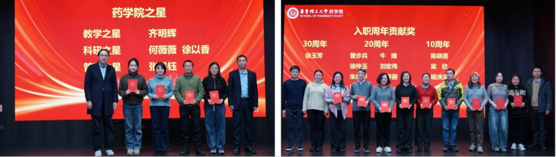 会上,学院党政班子为“药学院之星”获奖教师颁奖。齐明辉老师积极开展课程建设工作,负责的《质量文化导论》课程入选第三批国家级一流本科课程,荣获“教学之星”。何薇薇老师在化学生物学领域开展前沿研究,取得系列成果,并将研究深度融入教育部“101计划”核心教材编写,将前沿成果有效转化为教学资源与人才培养实践,徐以香老师积极开展原创靶标发现与新药研发,已获得多个临床前候选化合物,并实现2项技术转让,两人双双荣获“科研之星”。张旻钰老师以青春之力育时代新人,在学院团学建设工作中形成特色做法,荣获“管理之星”。此外,班子成员还为在校贡献30周年、20周年、10周年的教职工颁发荣誉证书,感谢老师们长期以来以坚韧不拔之姿默默坚守,用精益求精之态倾心耕耘。最后,2025年新入职的老师们依次上台作自我介绍,并带来了精彩的节目表演。