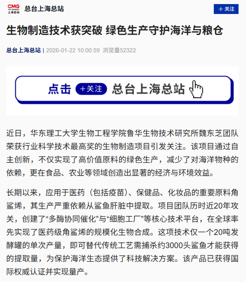 【中国新闻网】上海科研团队攻克角鲨烯生物合成难题 引领绿色制造新方向